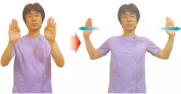 正常位站立,双上臂肘部弯曲,手心向外,双上臂朝向左右两侧展开。