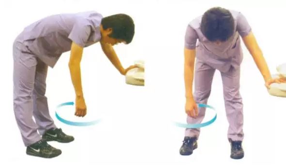 弯曲上身,两脚与肩同宽,将疼痛的胳膊自然下垂,放松,分别按顺时针方向和逆时针方向旋转2分钟。