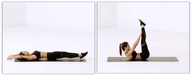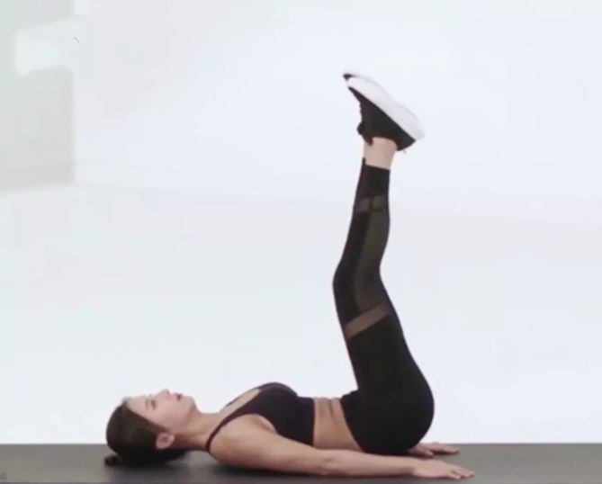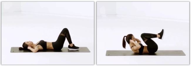 ●躺于垫上,手臂伸直放于头部两侧,腹肌发力起身。