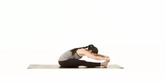 ●身体继续向前折叠,鼻子慢慢靠近小腿。