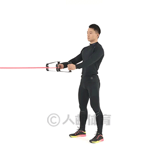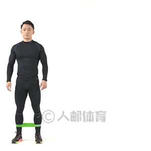 保持背部挺直,弯曲膝关节,同时向后拉伸弹力带。