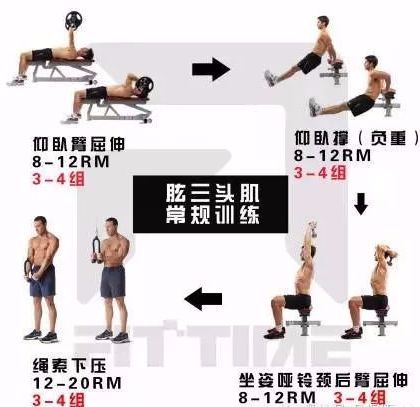 三头肌在我们练胸肌和肩膀的时候作为辅助肌肉已经得到了刺激,因此不经常的但大强度的三头肌训练方案更有效果。
