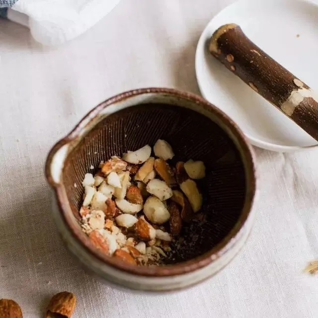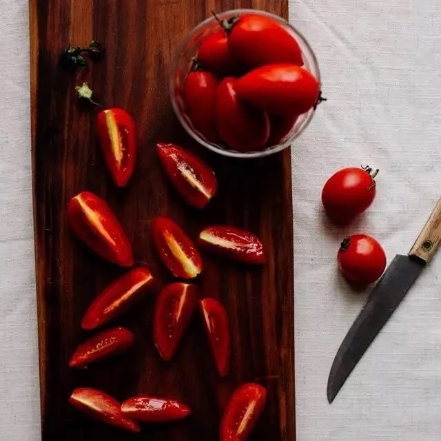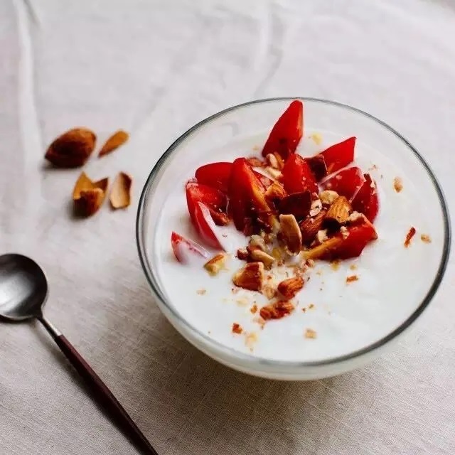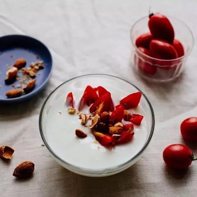 酸奶倒入小碗中,摆上圣女果,撒上坚果,圣女果巴旦木酸奶杯就做好了。