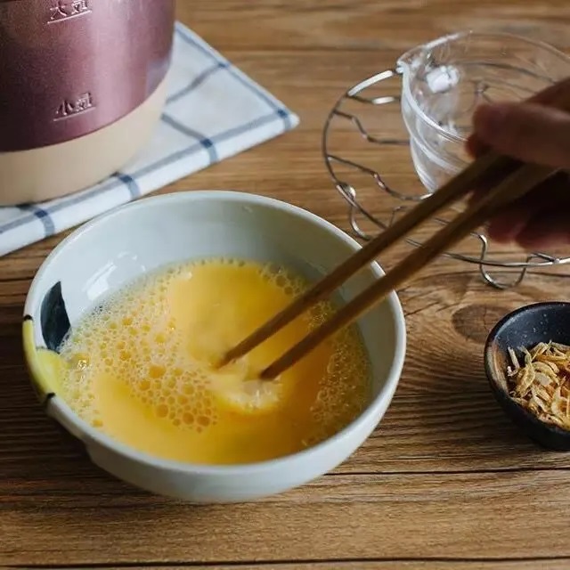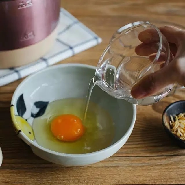 将鸡蛋打入碗中,并加入 50ml 的温水。