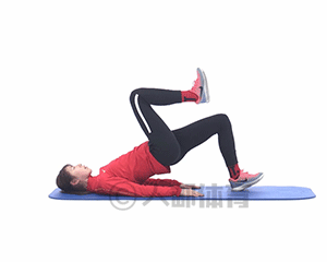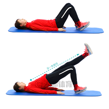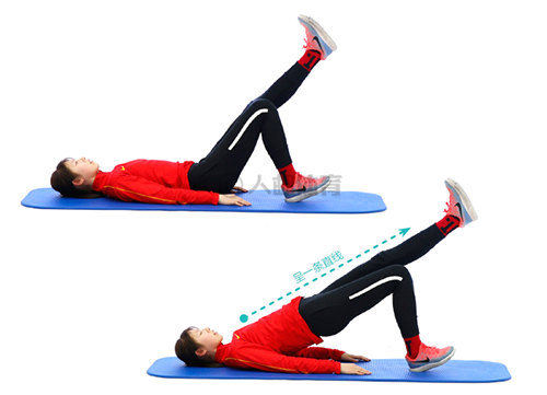 2.腹部和臀部收紧,抬起髋部至躯干与膝部在一条直线上。2~5秒后,髋部慢慢落地,并保持抬起腿伸直。重复以上步骤,并完成规定的次数,对侧亦然。