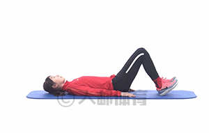 1.身体呈仰卧姿,双腿屈膝,脚尖勾起,脚跟着地, 双手放在身体两侧,自然摆放。