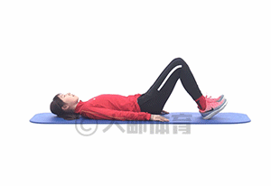 1.身体呈仰卧姿势,一侧腿屈膝,脚跟触地支撑。另一侧腿屈髋屈膝抬起,双手抱住非支撑腿的膝部。