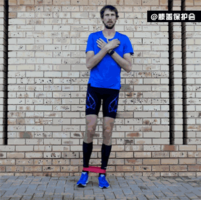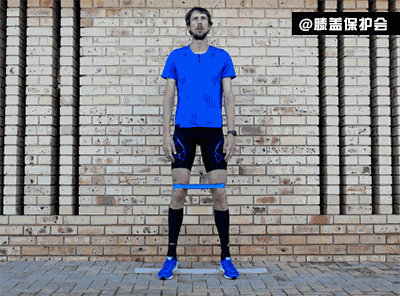 双脚与肩同宽,背部挺直,将弹力带绑在膝盖上方,开始慢慢下蹲,重复10次。