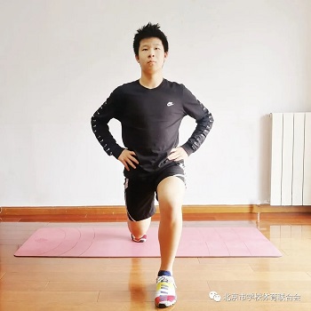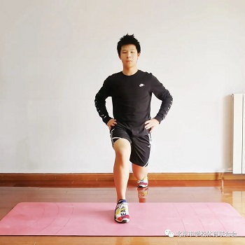 并立准备,左脚开始,向前弓步及还原、向后弓步及还原、向侧弓步及还原、向右后交叉弓步及还原,然后换另一侧,此为一次练习,左右交替进行。注意弓步时上体正直,膝盖的方向与脚尖一致,弓步的高度由力量的大小决定。