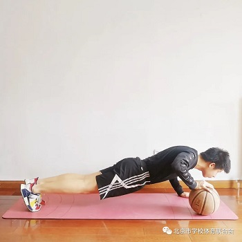 俯卧撑开始,两手中间放置一球,核心发力,保持躯干挺直稳定的状态,两手依次左右拨球,能力允许的同学,可以在拨球之间加做一手支撑地面、一手支撑球的俯卧撑动作。