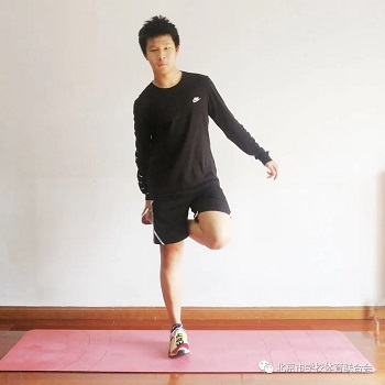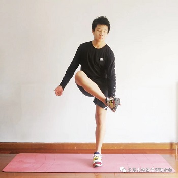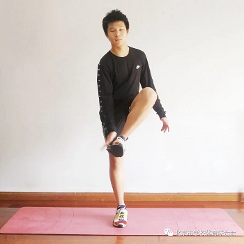 站立开始,向前抬左脚,右手拍打左脚,还原;向前抬右脚,左手拍打右脚,还原;向后勾左脚,右手拍打左脚,还原;向后勾右脚,左手拍打右脚;重复进行。从原地动作慢慢过渡到加上垫步的动作,逐渐提高速度和动作频率。
