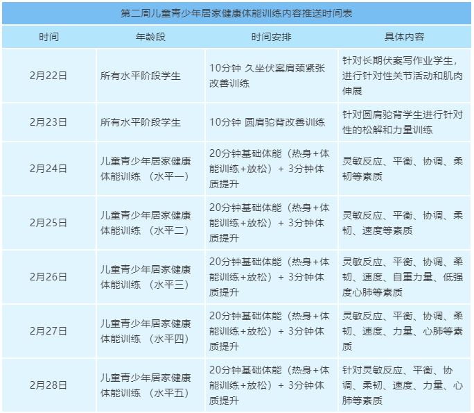 5.锻炼内容分为热身+体能训练+放松,请各位家长监督学生做好热身和放松,避免出现运动损伤。