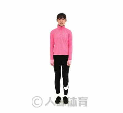 1、身体呈直立姿站立。双腿伸直,双脚分开,双臂自然垂于身体两侧。保持腹部收紧,双脚跳动,抬一侧腿屈髋屈膝至大腿与地面接近平行,同时抬对侧手臂伸直举过头顶。