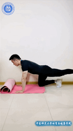 手掌与前脚掌作为支撑,膝盖离地,头、背、臀呈一条直线,大腿垂直于地面,小腿与地面平行;支撑15-20秒后,蹬地伸膝5次。