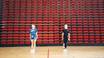 5—8拍:双脚开立,双手叉腰,耸肩两次。