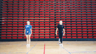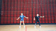 5—6拍:分腿屈膝半蹲,双手侧平举。