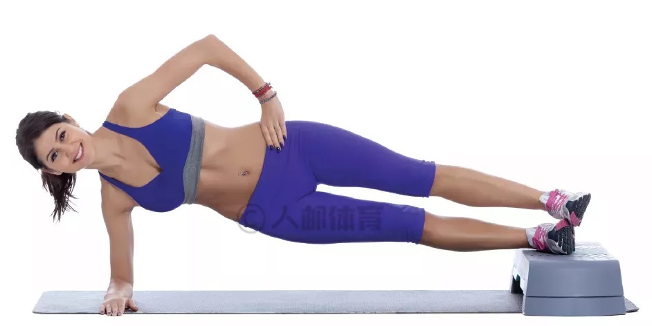 双脚支撑在台阶上,做前臂侧平板支撑。换侧重复动作。