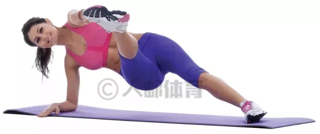 做前臂侧平板支撑,将下面那条腿向上抬,然后用上侧手臂的手去碰触上抬腿的脚尖。换侧重复动作。