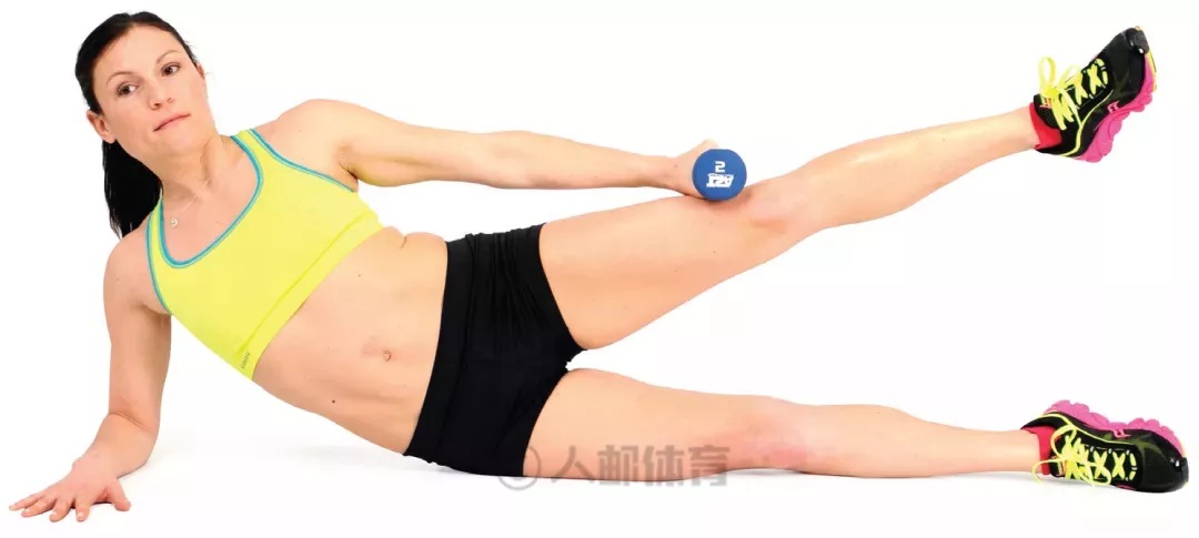 右侧卧,右臂弯曲,右前臂着地支撑身体。左臂沿体侧伸展,手持哑铃。保持身体其他部位不动,慢慢抬高上侧的那条腿。然后慢慢放下恢复至初始位置。根据需要的次数重复动作,然后换侧重复动作。