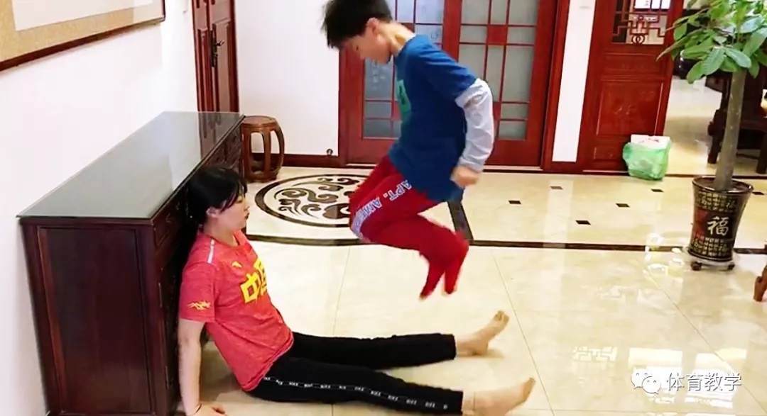 2.听到开始口令,坐在地面者两腿贴着地面滑动分开约成30°夹角(也可视跳跃者能力而定),同时另一人原地跳起后双腿缓冲落在坐地者的两腿中间,两人连续协作开合跳,10次为一组。