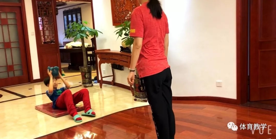 3.站立者原地3次开合跳后站定,把手中布娃娃抛给坐垫上者,其接住布娃娃后做仰卧起坐1个,再把布娃娃抛给站立者,两人协同完成抛接,10次为一组。