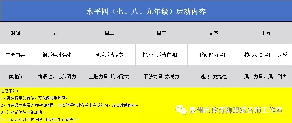 新型冠状病毒疫情形势严峻,多地启动“突发公共卫生事件一级响应”措施。疫情期间减少出行,可以有效遏制疫情的进一步扩散。但是,长时间居家缺乏运动又成为新的问题。泉州市中小学体育柳惠斌名师工作室根据非常时期场地不充分,器材不足等情况,制定了停课不停练、居家运动指南(初中篇)。