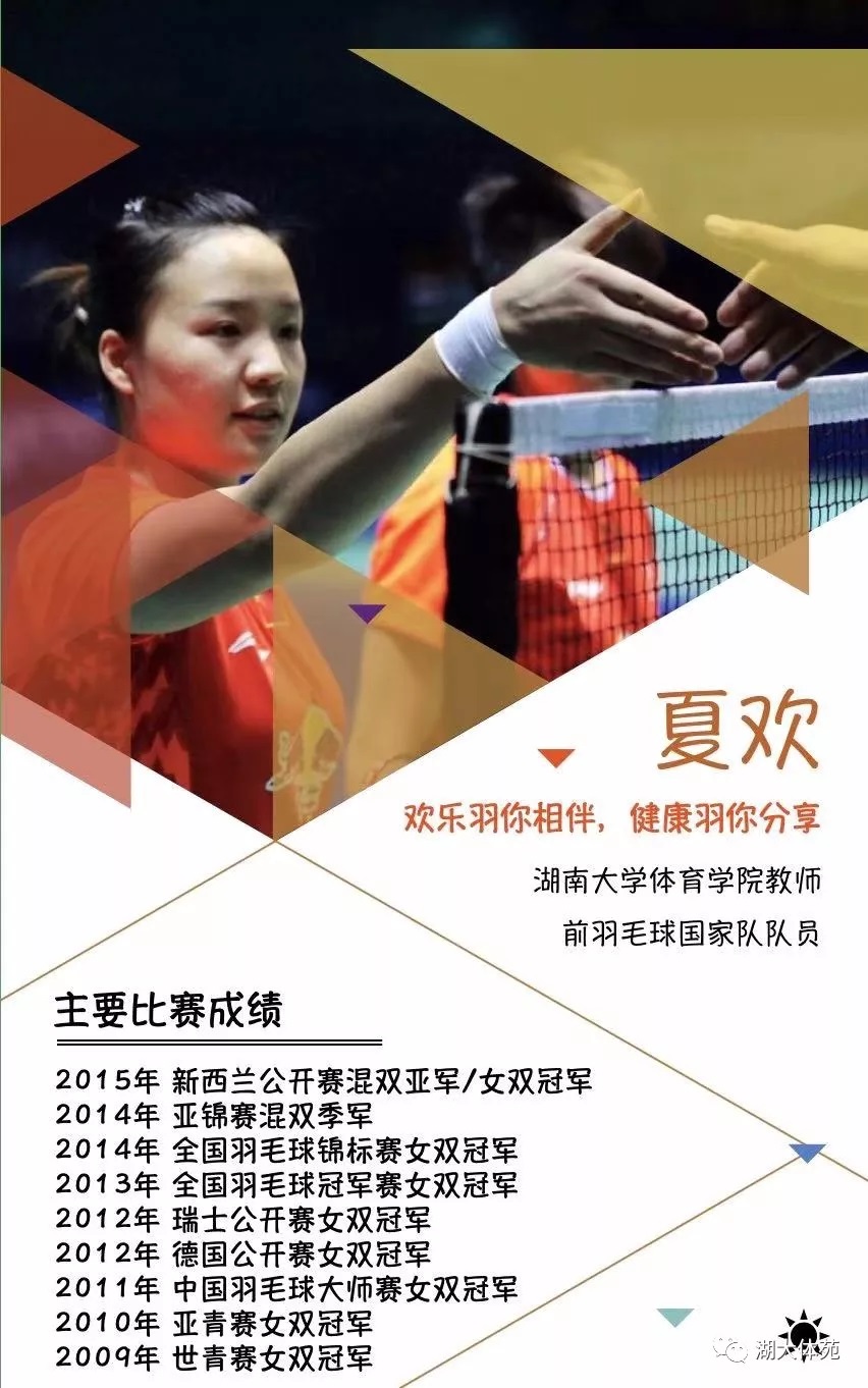 夏欢:湖南大学体育学院教师,前羽毛球国家队队员,多次参加国际、国家级比赛,曾获得亚青赛女双冠军、中国羽毛球大师赛女子双打冠军、瑞士/德国/新西兰羽毛球公开赛女双冠军等。现任湖南大学羽毛球队教练,主要从事羽毛球教学训练工作,多次带队参加国家级省级比赛取得佳绩。
