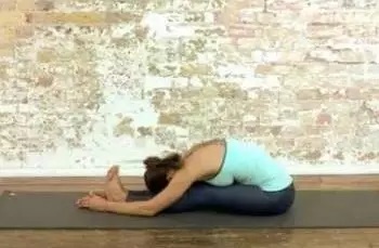 动作要领:坐于垫上,两脚掌心相对,双手抱住脚尖,俯身向下,额头贴地。