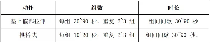 动作训练:每组 30~90 秒,重复 2~3 组,组间间歇 30~90 秒。