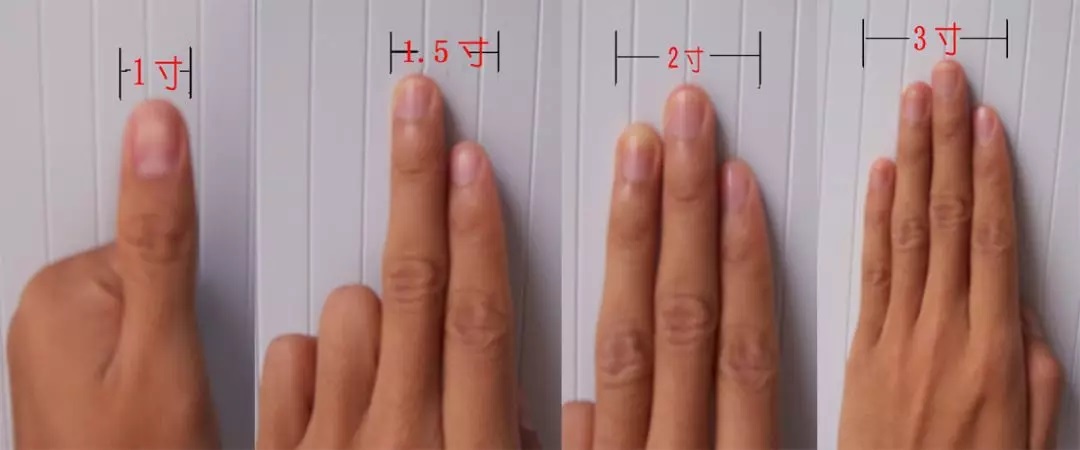 按摩者将食指、中指、无名指和小指并拢,以中指近侧指间关节水平为准,两指横量为1.5寸,三指横量为2寸,四指横量为3寸。