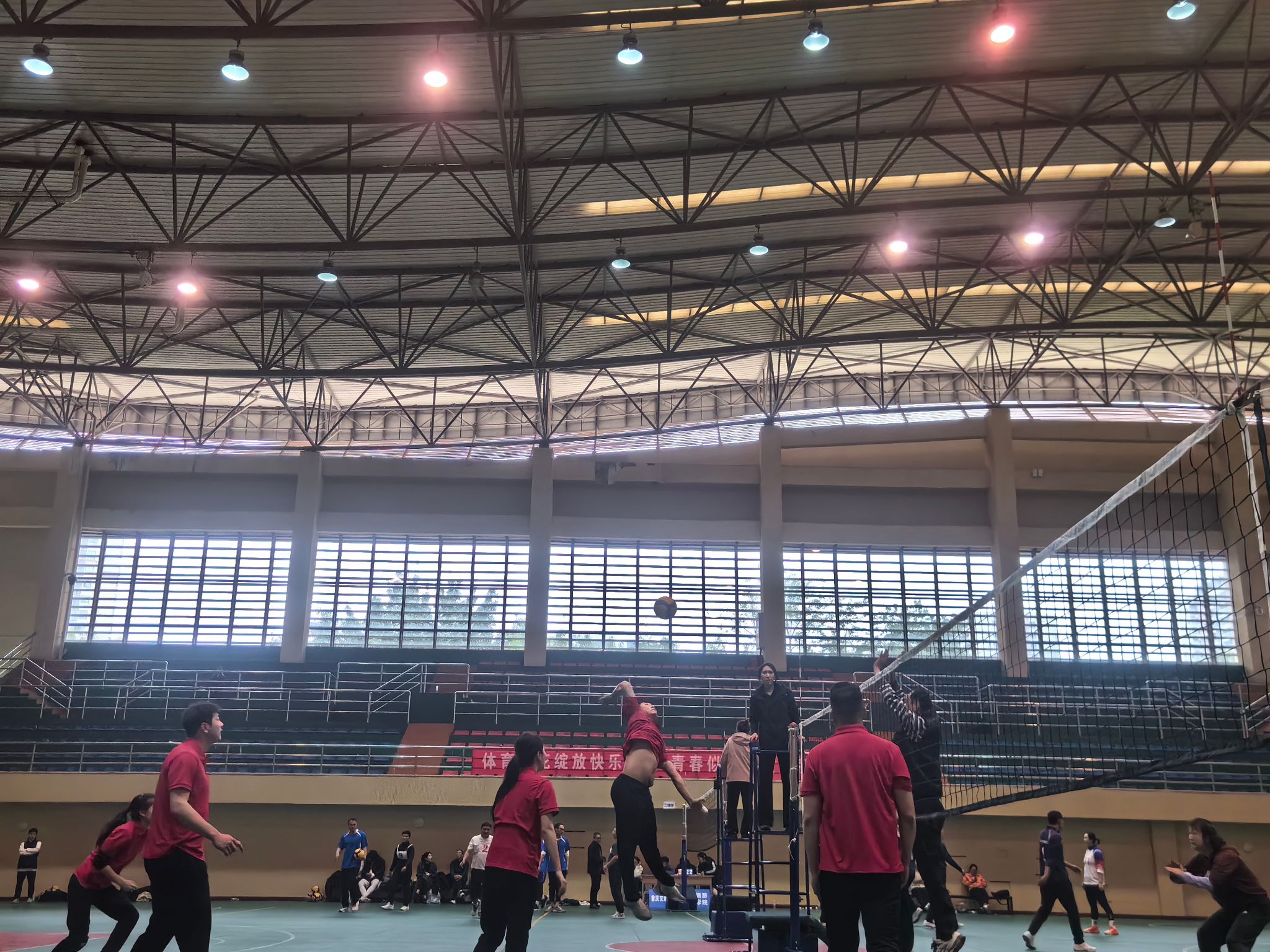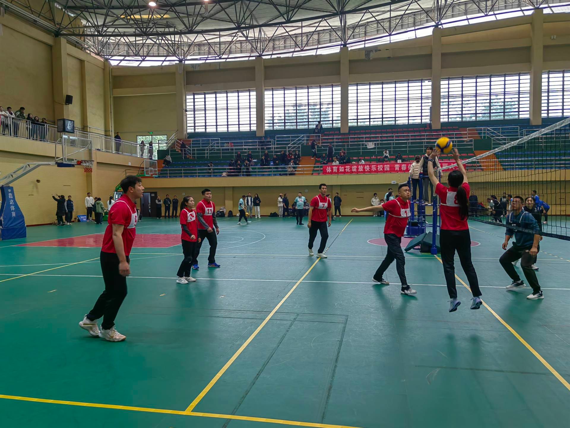 赛场上,各高校参赛队似脱缰骏马,尽显超凡实力与拼搏精神。重庆移通学院由合川、綦江校区联合组建的教职工队,更是训练有素,表现夺目。发球时,他们手臂有力,排球如炮弹般飞向对方;接球时,队员眼疾手快、灵活走位,稳稳垫球;传球时,彼此心有灵犀,路线精准;扣球时,高高跃起如雄鹰展翅,凌厉扣杀令对手防不胜防。每个动作流畅自然、一气呵成,尽显扎实基本功与精湛球技。