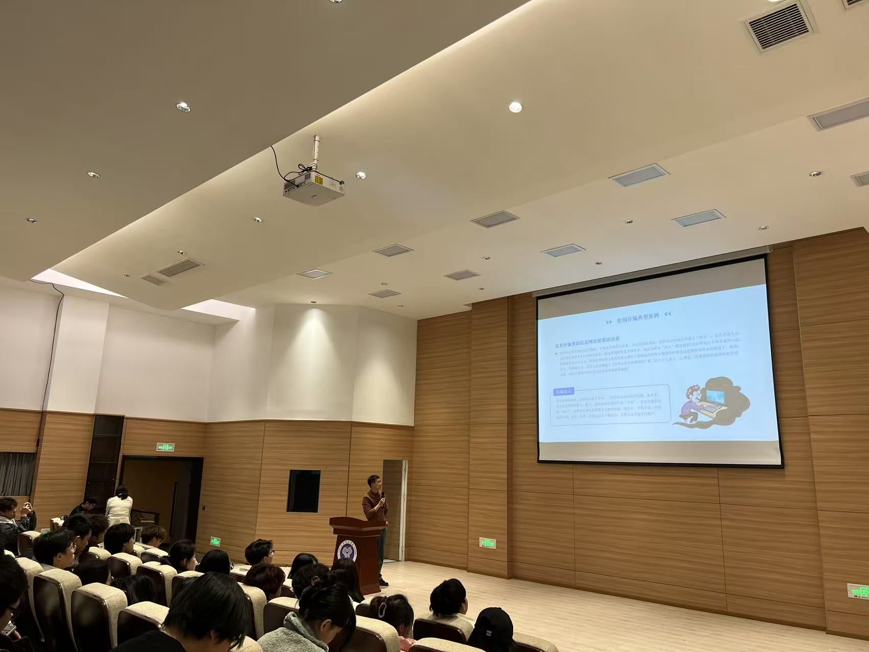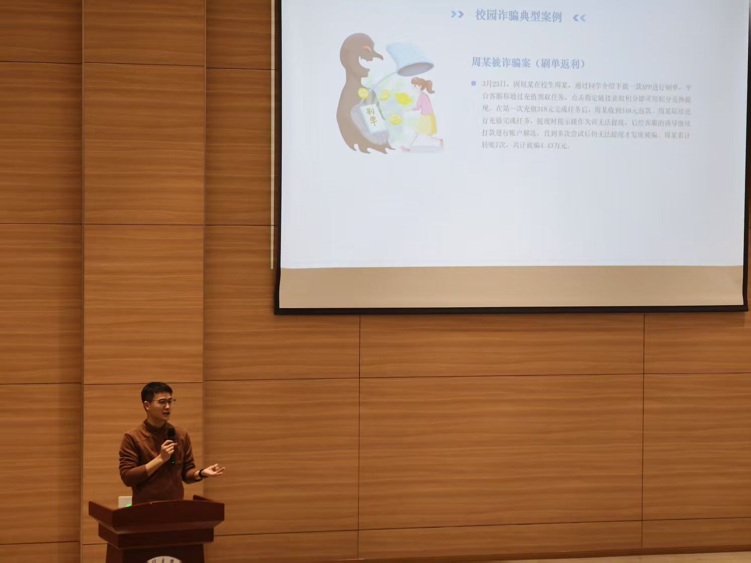 本次讲座特邀营地教育中心资深讲师张国皓担任主讲,并以“典型案例+特点剖析+实战锦囊”为主线,从校园诈骗典型案例、高校诈骗三大特点、五大形式、预防诈骗六条锦囊及应急处理指南五方面展开深度解析,吸引全校师生代表150余人参与。活动通过真实案例剖析、反诈知识普及等,助力师生提升防骗意识,为校园安全注入新动能。