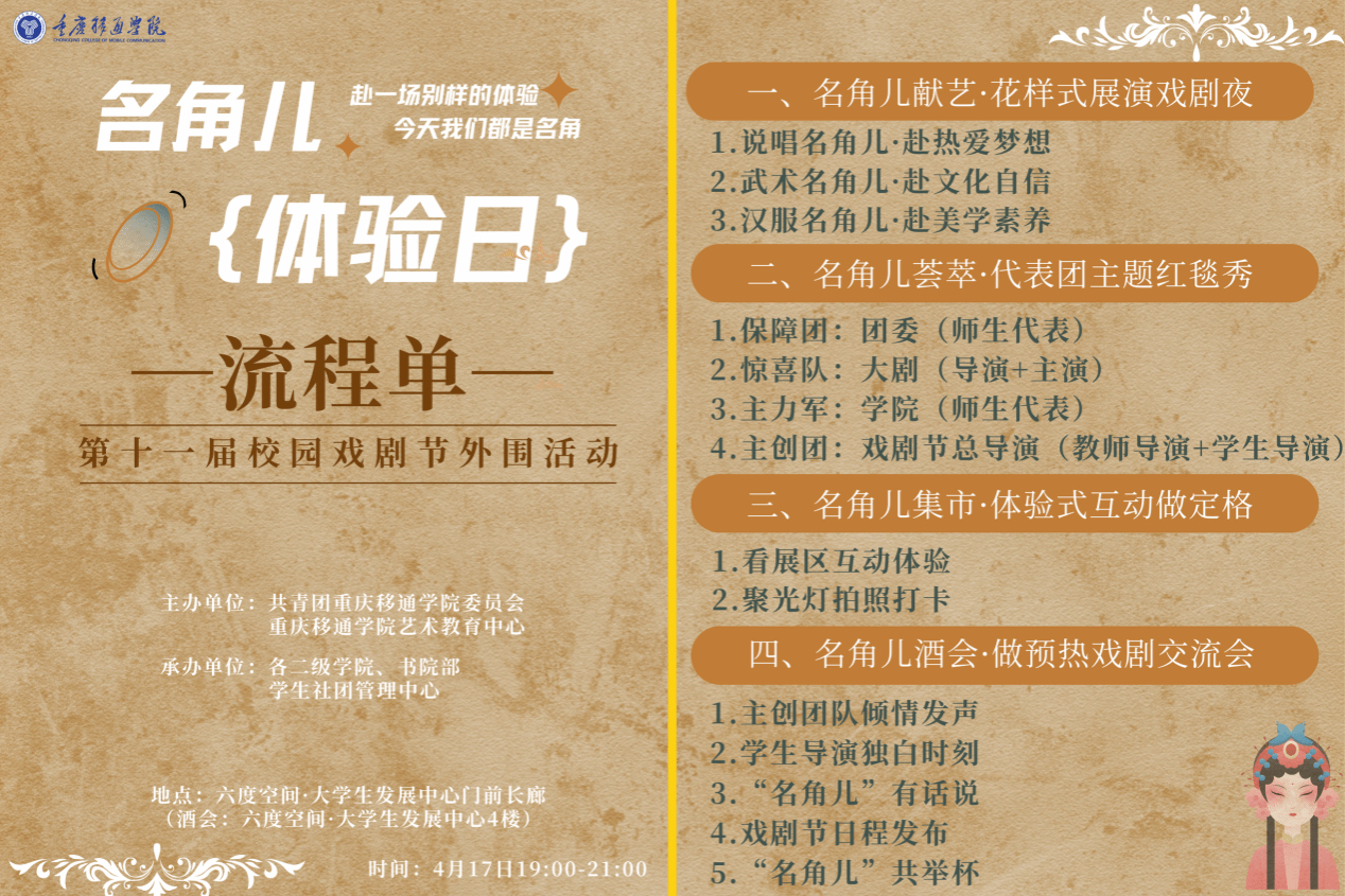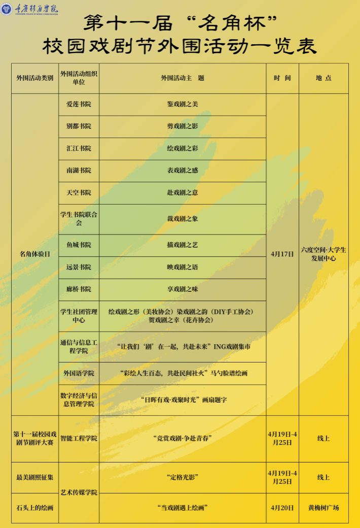 通信与信息工程学院、外国语学院、数字经济与信息管理学院画扇题字、ING戏剧集市,爱莲、别都、汇江、南湖、天空、鱼城、远景、廊桥书院和学生书院联合会带来的皮影戏的操作、创意设计脸谱、戏剧唱片DIY、戏剧造型剪纸、彩色画布扎染等体验,以及社团利用美妆、手工、花卉打造画布扎染等特色互动,旨在通过形式各异的体验活动带你深刻感受戏剧的风格和特点。