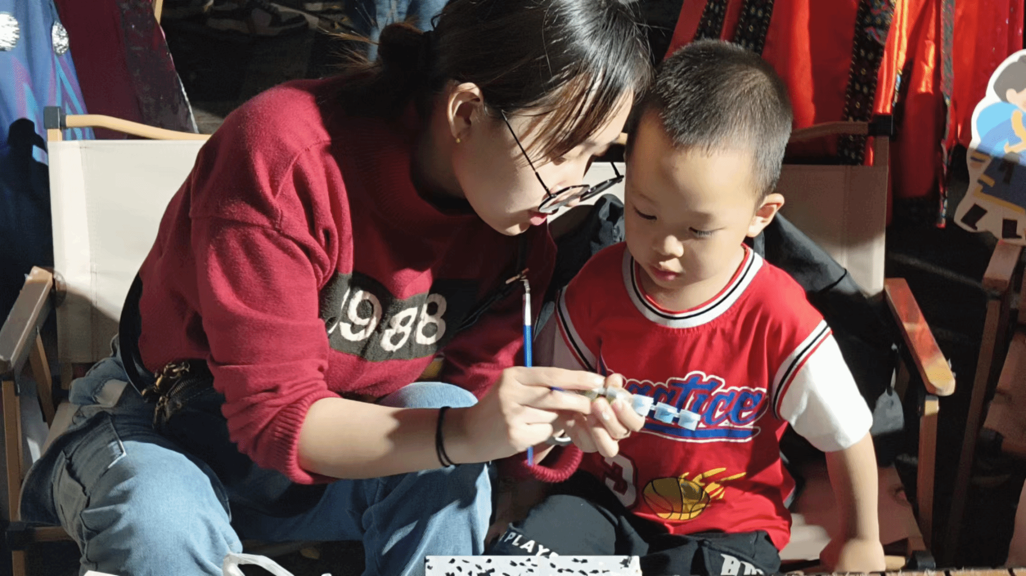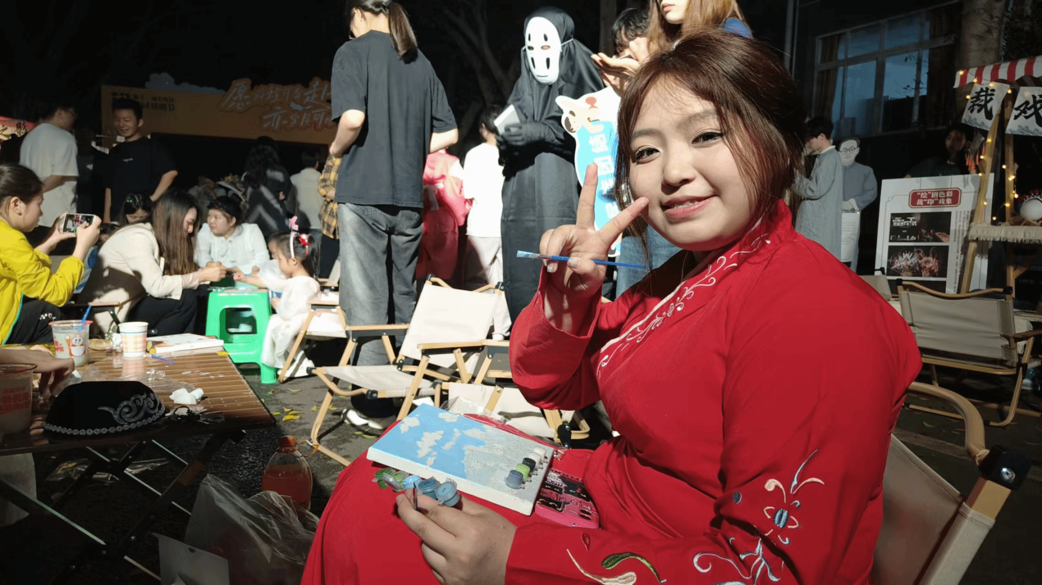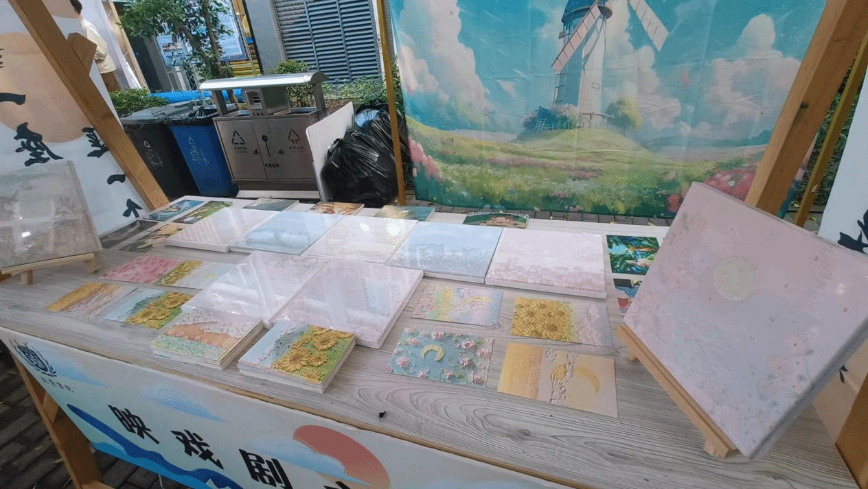 色彩,是约绘漫时光的象征,若是与戏剧相结合,两者更是碰撞出了“执色彩之笔,绘戏剧之深韵”的创意火花,这也是本次远景书院戏剧节外围活动的意义所在。活动现场色彩与戏剧文化的碰撞,戏剧与趣味DIY的结合中体验一次天马行空的梦幻之旅,一次放飞想象的艺术之旅,在提高同学们艺术修养与实践能力的同时,激发对传统戏剧艺术的热爱,参与者们不仅仅有前来观看“名角”盛宴的同学们,更是吸引了众多小朋友们、老师们的青睐,大家身着靓丽独特的“角色”服饰,围坐在摊前执笔起绘,一笔一划在画板上妙笔生花,勾勒线条,用鲜艳的色彩和图案,绘出心中戏颜,宛若行云流水绕素笺,五彩斑斓描戏语,形成了最为亮丽的一道风景线。不一会儿,一幅幅色彩鲜明,治愈系十足的油画大作,便在大家的指尖绽放,这不仅仅是视觉和文化的“碰撞”,更是创造力、专注力与审美能力的结合。