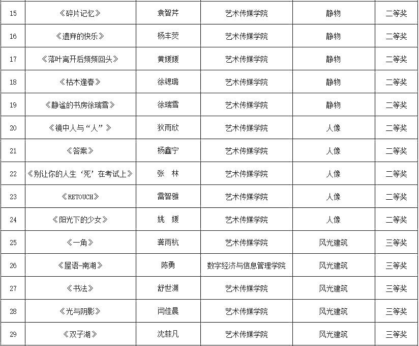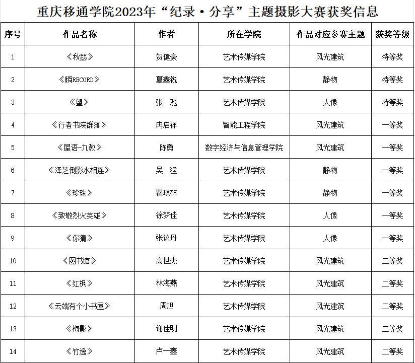 本次比赛共设有特等奖、一等奖、二等奖、三等奖及优秀奖等多个奖项,用以表彰参赛者的杰出表现。在此,我们向所有获奖的同学表示热烈的祝贺,并期待在未来的日子里,大家能够继续用镜头捕捉生活的精彩瞬间,用光影记录时代的变迁。