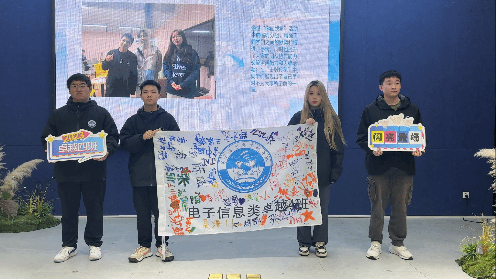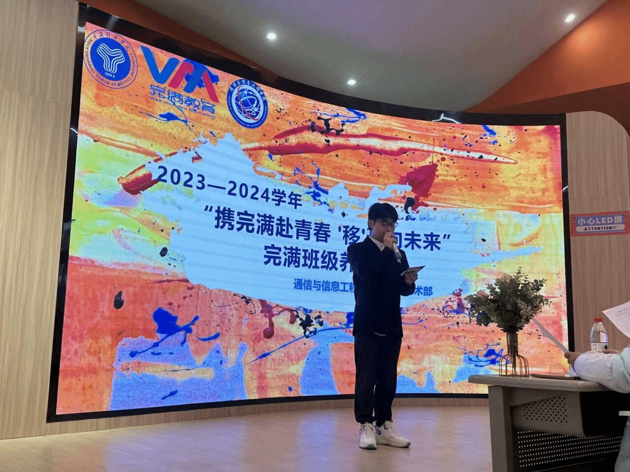 在主持人宣布本次成果展开始之后,每个班级依次上台开始展示。各个班级的答辩主讲人语气抑扬顿挫,感情饱满,班徽班服设计都独出心裁,别有意义。各个班级举办的突出活动和制作的班级vlog也别具一格。他们以艺术为笔,以班级整体为纸,绘成图案,充分体现了班级精神,也积极响应了完满教育理念。