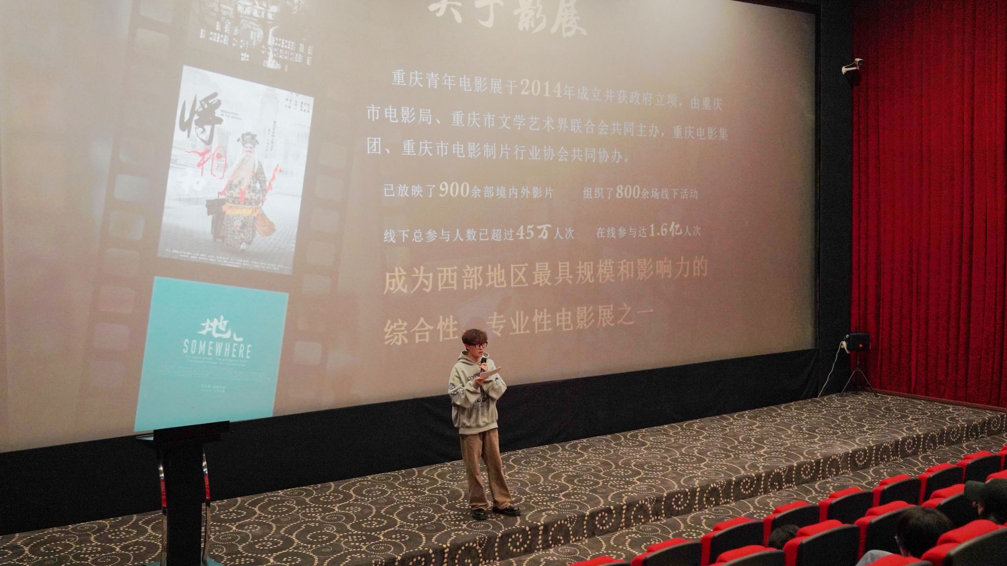 短片放映之前,由主持人黄加昊带领观众回顾了往届重庆青年电影展影展人海清主演的宣传片,并对重庆青年电影展与放映的短片背景做简要介绍。