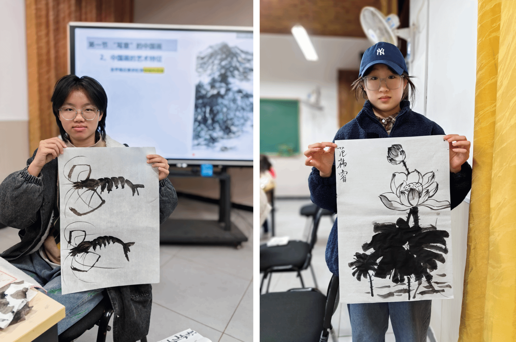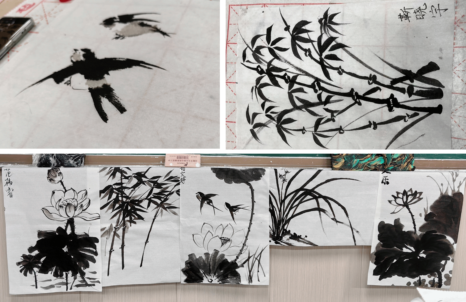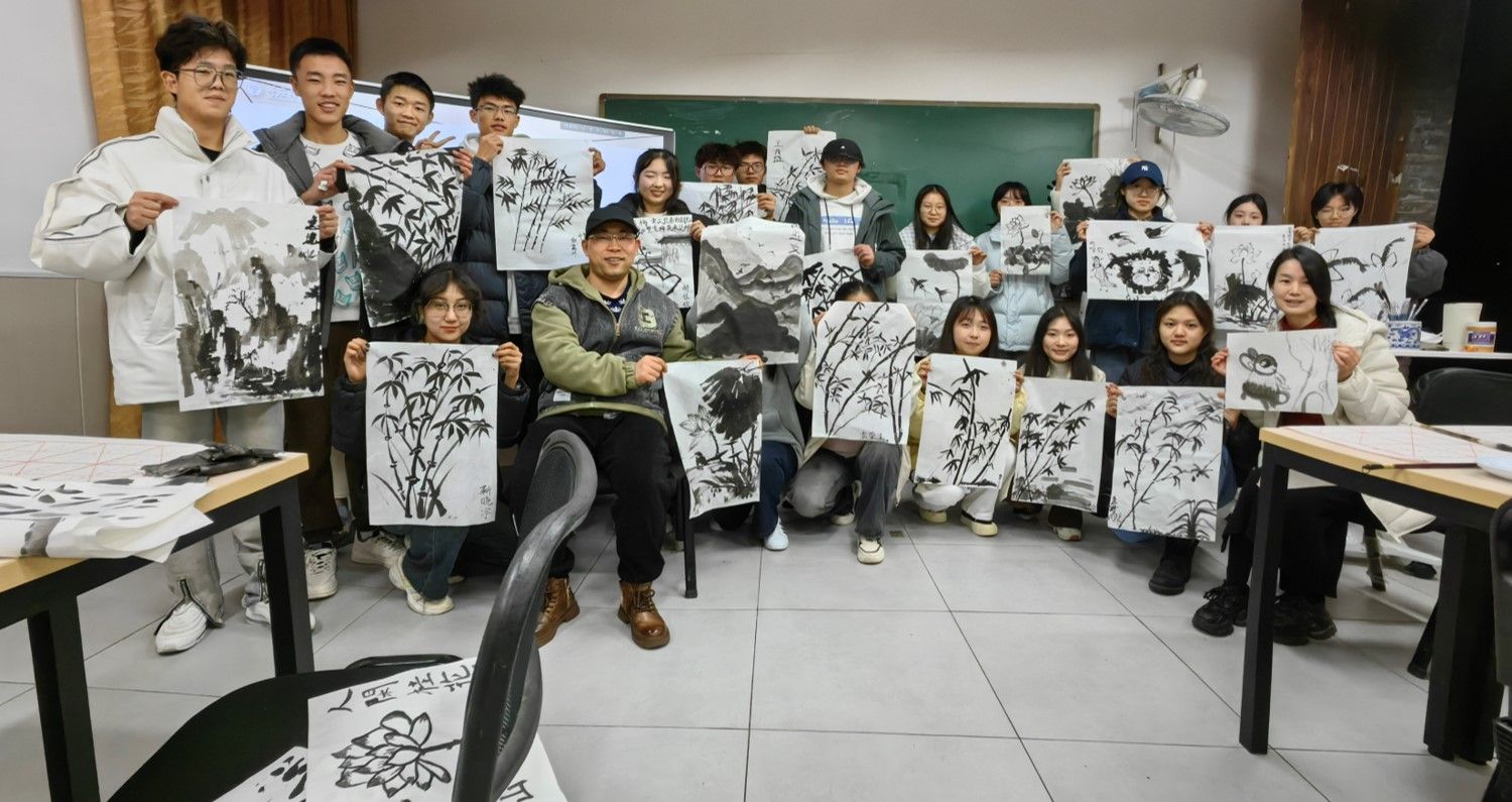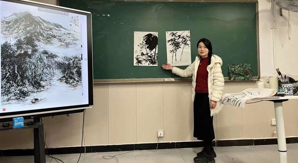 同学们亲自感受水墨的乐趣,将抽象的艺术鉴赏词汇与绘画实践进行联系。此刻,书上晦涩的专业名词有了具象的表达。水墨丹青肆意晕染泼洒,是豪情也是柔情。时间也在一笔一画中偷偷溜走,这堂课最终定格在相机前同学们展示画作的瞬间。这堂课始于理论,终于实践。