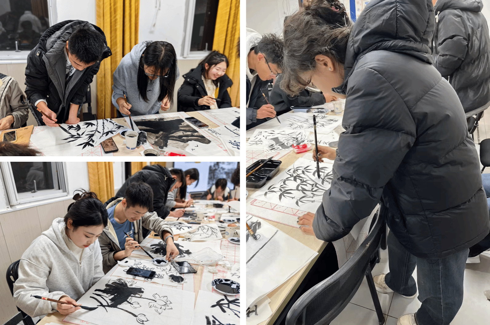 “纸上得来终觉浅,绝知此事要躬行,大家行动吧。”待赵老师话音一落,同学们迫不及待地拿起笔在纸上比划着。很快,有些同学开始发愁了,发现国画并不是看起来那么简单,下笔和墨色的掌握太难了。“国画和西方绘画不一样,素描、油画就可以反复修改,国画则落笔成形,几乎不可改动。所以国画能锻炼我们的判断力,培养我们胆大细心、求真务实的思维能力和心理素质嘛”,课堂上有同学在讨论。在创作的过程中大家遇到的难题,梁老师都细心解答,顺便又做了兰、竹的示范。有的同学觉得自己画的不像,两位老师为其解惑:“国画讲究的是意境呈现,追求“不似之似”,实现“以形写神”,讲究内涵,讲究真,善,美的表现,并不是一味地追求像,追求写实,你们看这节课的小标题‘写意’的中国画”。