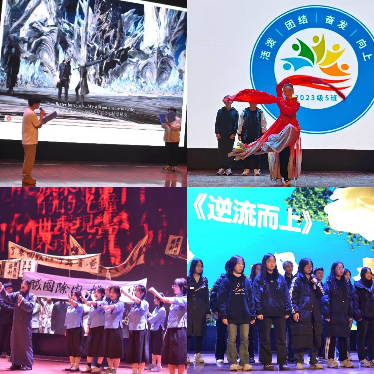 以舞蹈为翅膀,以歌声为航向,一起飞向那个美好的明天。德语1班一首《我们的明天》给同学们带来了对未来的憧憬;有志之士的爱国热情,爱国运动毫不妥协,若他们看见如今的祖国,又会是怎样一个场景。德语2班为我们解惑;单人朗诵不逊风采,独创舞蹈更是独具特色。翻译1班的合唱歌曲《遇见》让观众们沉醉;家人闲坐,炉火可亲,围炉夜话。翻译2班的短剧让人身临其境;点赞,分享,发现抖音精彩,英语五班结合时事,将舞台表演与生活紧密联系,趣味性十足;英语三班的同学们着一身民国服装登场,愿以吾辈之青春,捍卫盛世之华夏;少年不惧岁月长,彼方尚有荣光在。英语十班眼神坚定,有如他们的歌曲《逆光》,彰显着逆光而行的决心。