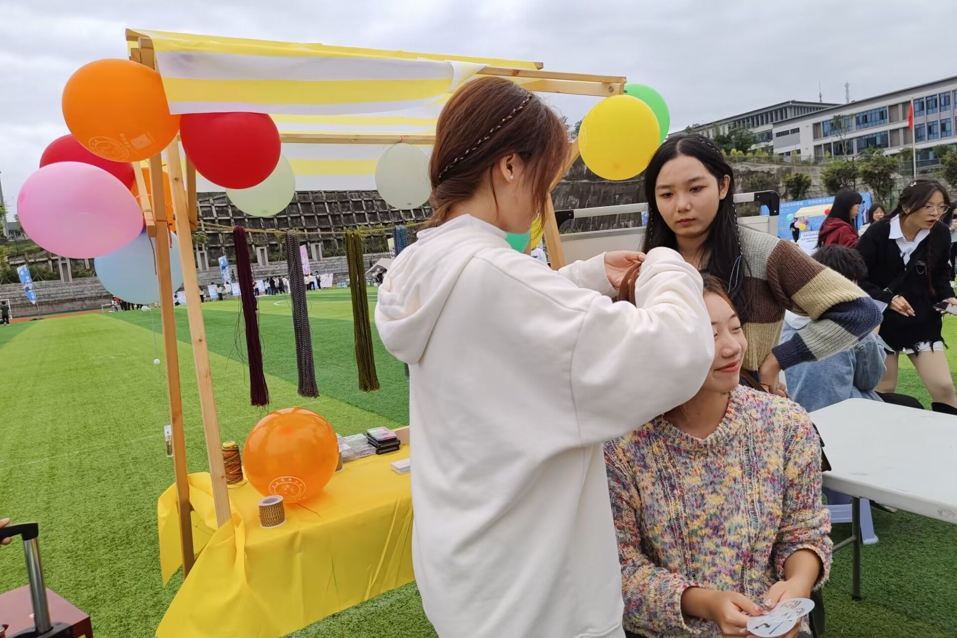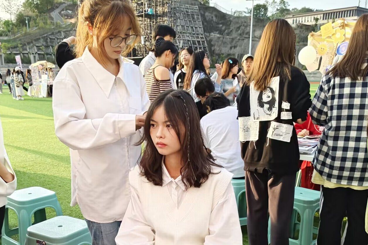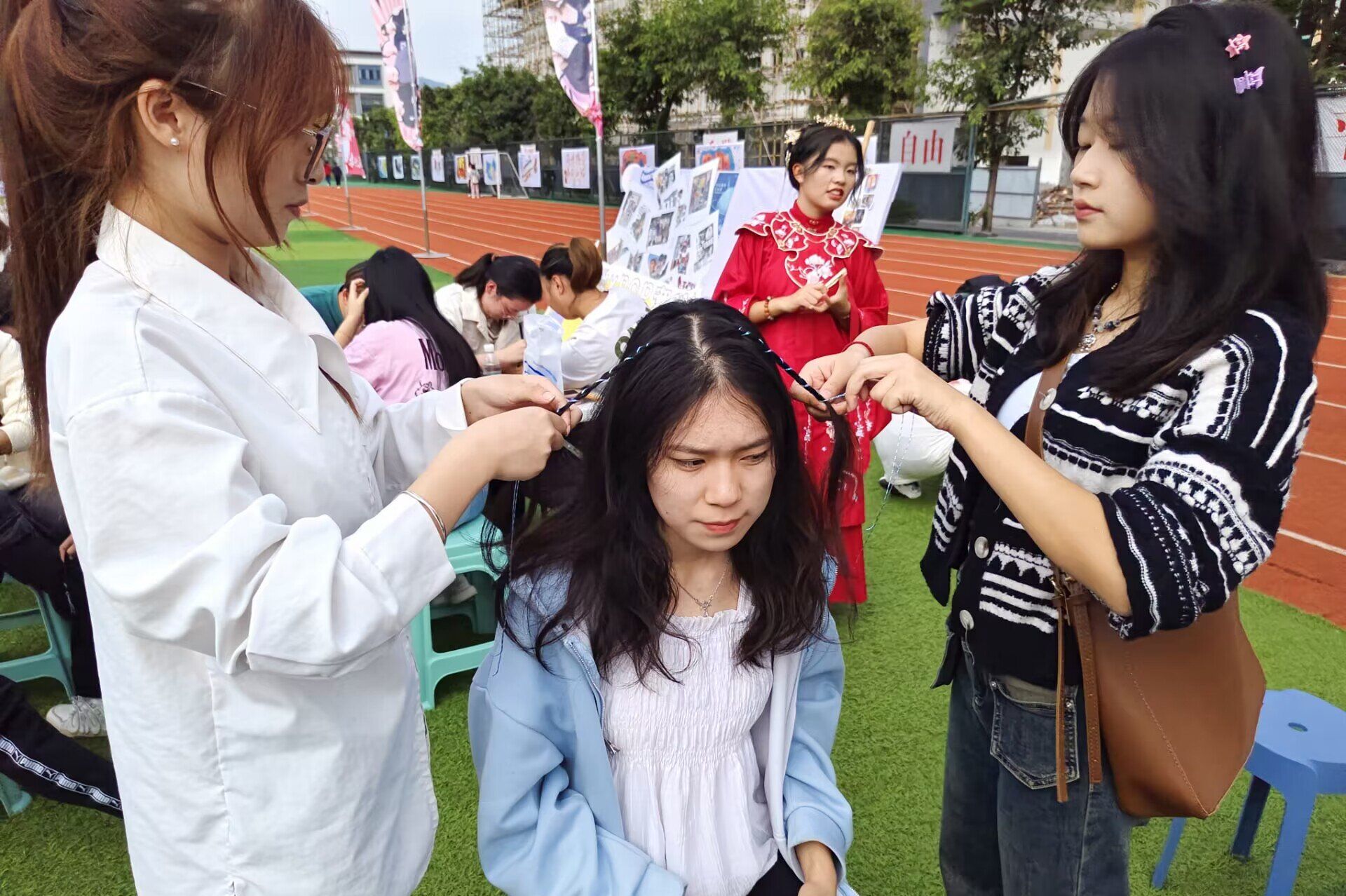 艺术部联合colorful彩妆协会为同学们编彩辫,充分发挥了大家的想象力和创造力。在这里,同学们可以随意挑选不同颜色的彩绳,让部门成员们为她们设计不同样式的辫子。这形成了一道靓丽的风景线,彰显了同学们的青春特色,让同学们亲身体验到这次活动中。