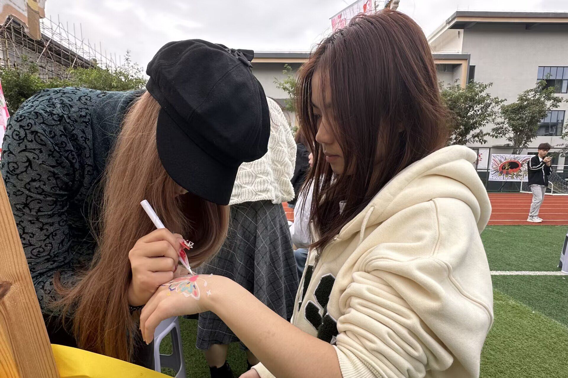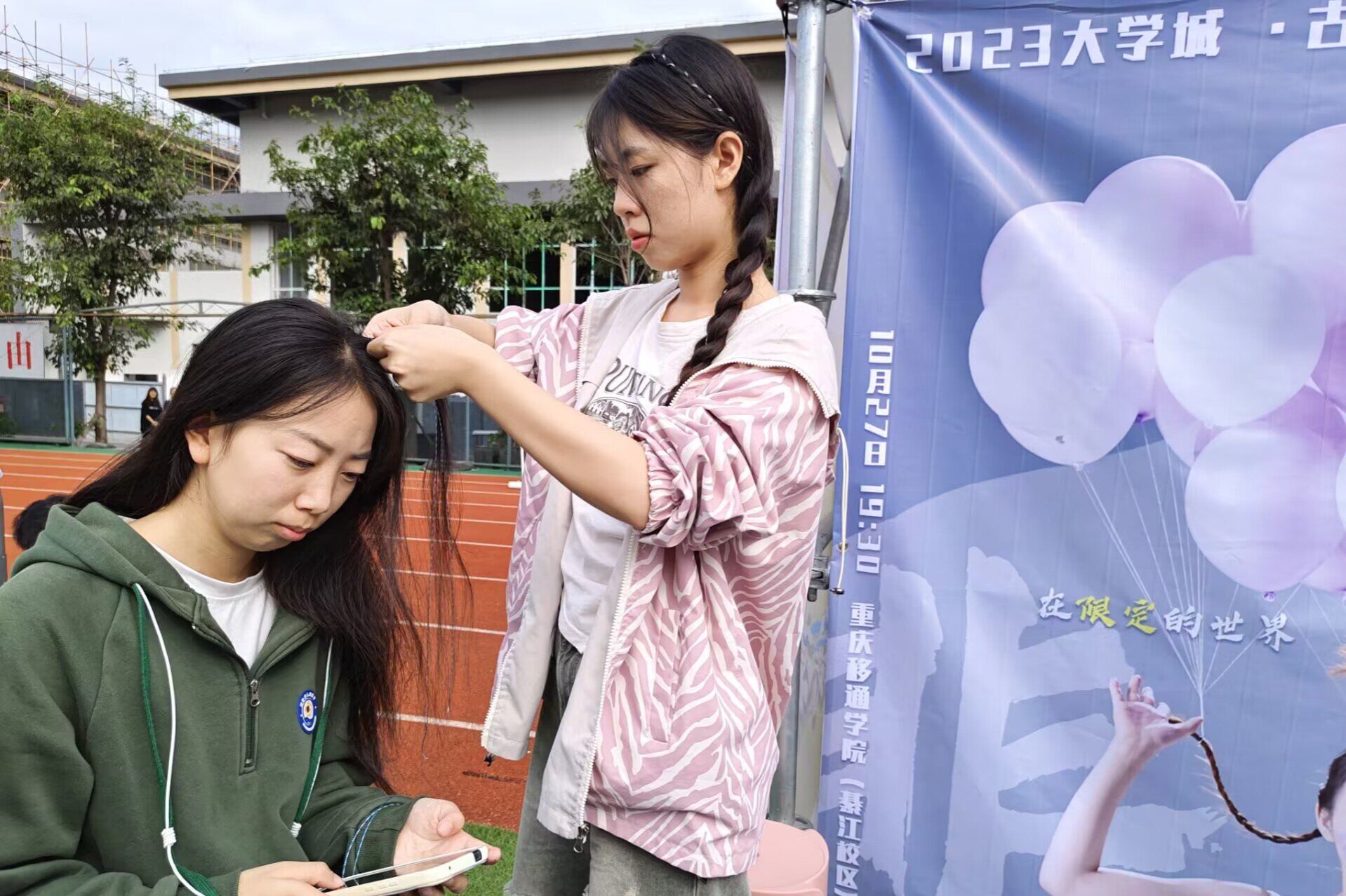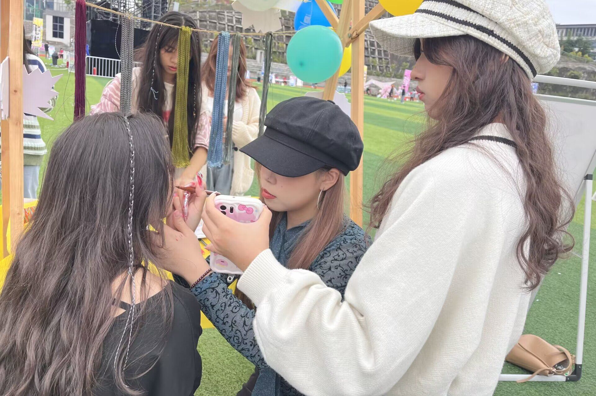 艺术部联合colorful彩妆协会为同学们编彩辫,充分发挥了大家的想象力和创造力。在这里,同学们可以随意挑选不同颜色的彩绳,让部门成员们为她们设计不同样式的辫子。这形成了一道靓丽的风景线,彰显了同学们的青春特色,让同学们亲身体验到这次活动中。