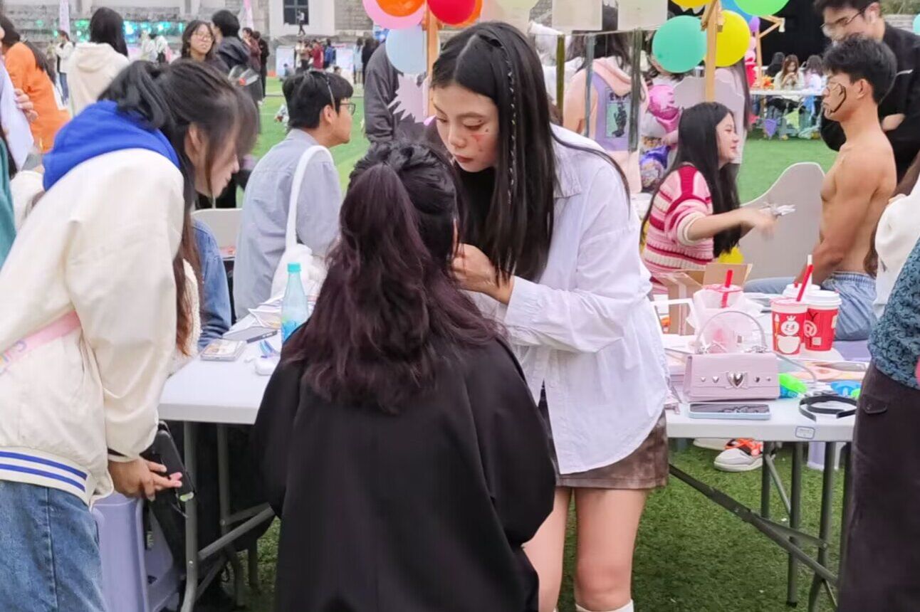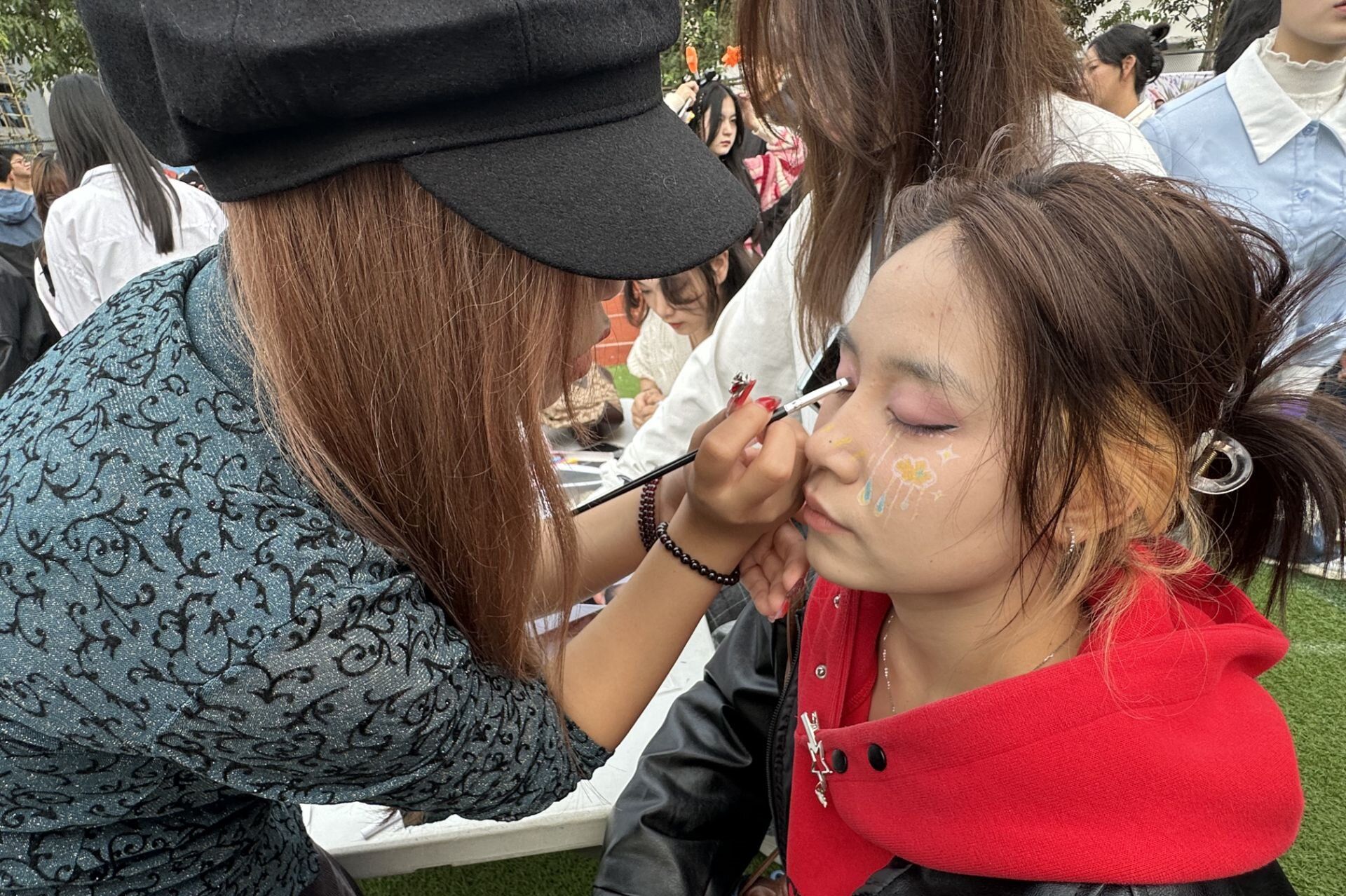 创意妆容改造 “创意妆容改造”音乐节外围活动的第一个板块,妆造富有创新与想象力,一起来diy创意妆容,让参加的同学们体会到妆容的个性与乐趣,吸引了许多喜欢化妆的同学们兴趣,排着长龙般队伍,有序等待工作人员化妆。化妆的工作人员与同学们一起交流探讨,发展爱好。工作人员根据同学们的需求和喜好进行妆造,眼影的色彩吸引眼球,各具特色。