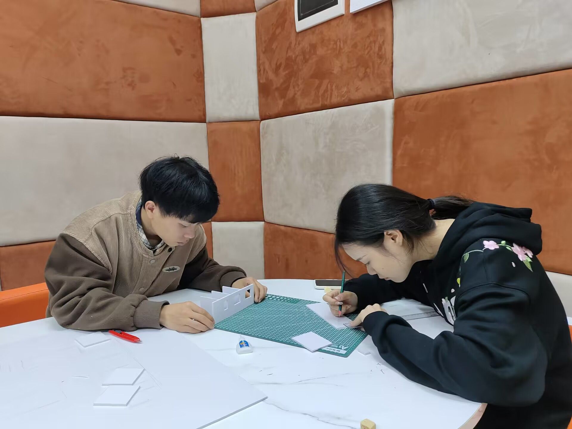 “天下大事,必作于细”在刘峰部长给同学们简单讲解完模型制作的一些基本要求后,同学开始实操,手工制作书院微缩模型看似简单,其中却暗藏玄机,材料的选择、裁剪与组装,色彩的选择与搭配,整体框架比例的设定等等,每一个选择都影响着模型整体的呈现。
