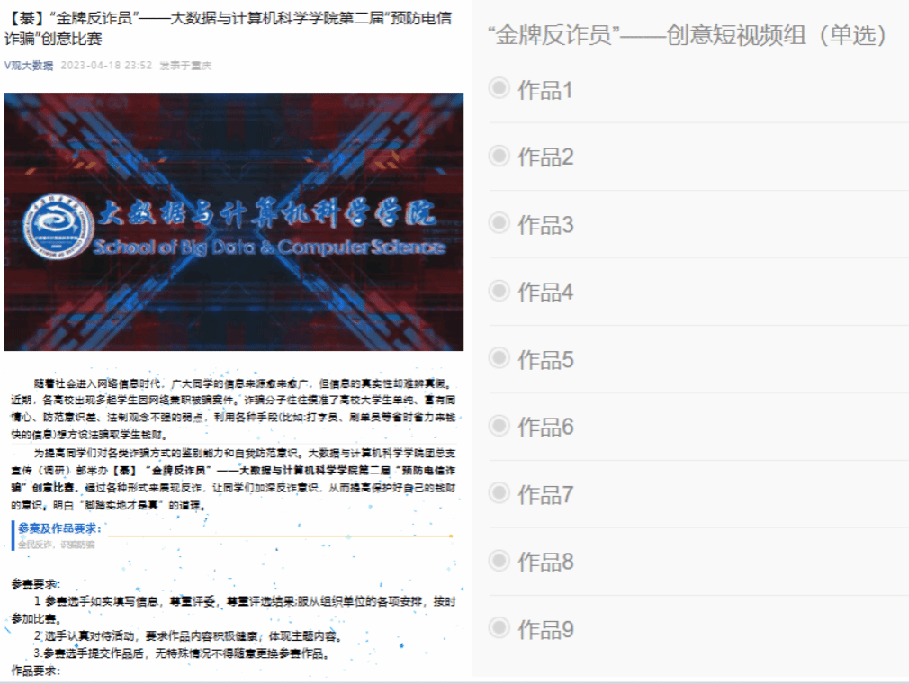 本次参加此次活动初赛的人员,也参考这些预防诈骗知识,进行自己的创作,拍摄具有特色的视频,制作精美有意义的海报,和准备着视频配音。有着对防范诈骗的积极宣传,他们热情的参加其中,希望能够让更多的人有预防诈骗的意识。本次初赛后将在微信公众号V观大数据进行投票决作品名次,同时也希望在决赛上他们具有更出色的表现。