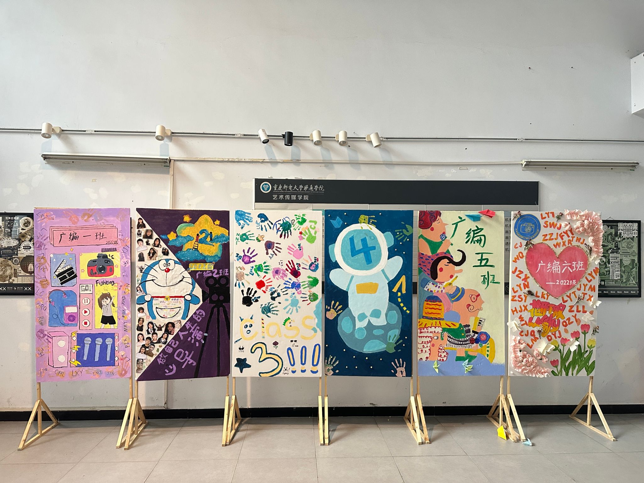 在各班有序领取物资后,同学们通过天马行空的想象,用画笔描绘出了属于各自的班级文化特色,16幅班级文化展板成为了展现多彩班团的缩影。现场投票环节,2022级数字媒体艺术10班同学们精心绘制的作品吸引了大批来往同学驻足观看,他们以大胆的构思、细腻的手笔,将班级成员绘画成一个个栩栩如生的卡通形象,凭借着丰富多样的色彩、抓人眼球的文案、独具特色的构思赢得了各位同学的喜爱;数媒8班的展板色彩绚丽夺目,也获得无数同学们的喜爱;广播电视编导专业各个班级将丰富的想象力和创新能力运用到展板上,再次向我们证明广编学子做得出电脑特效,也玩得转画笔颜料。通过老师和同学们激烈的投票,数媒10班以最高的票数赢得本次比赛。