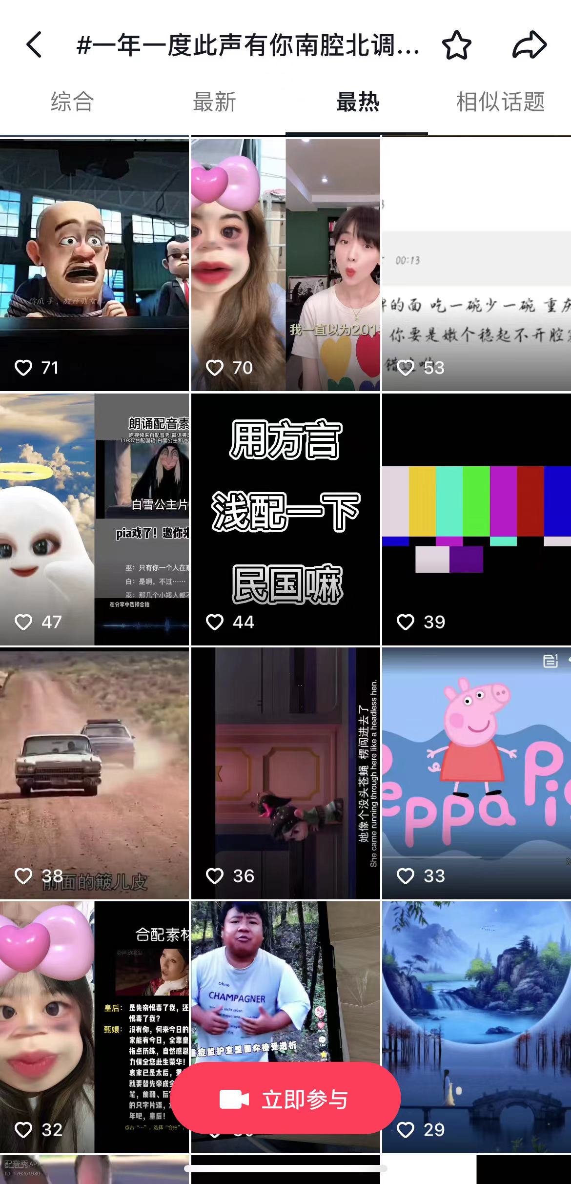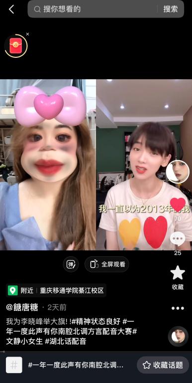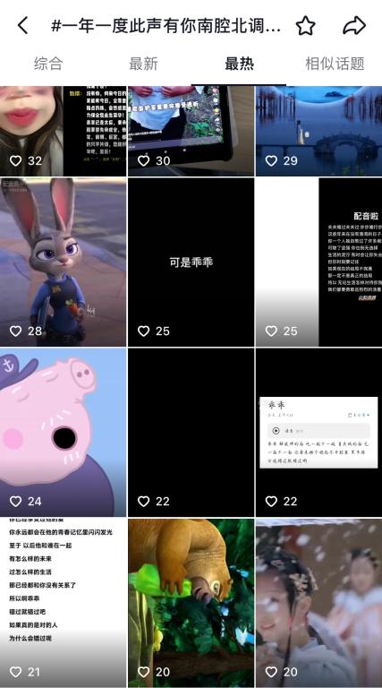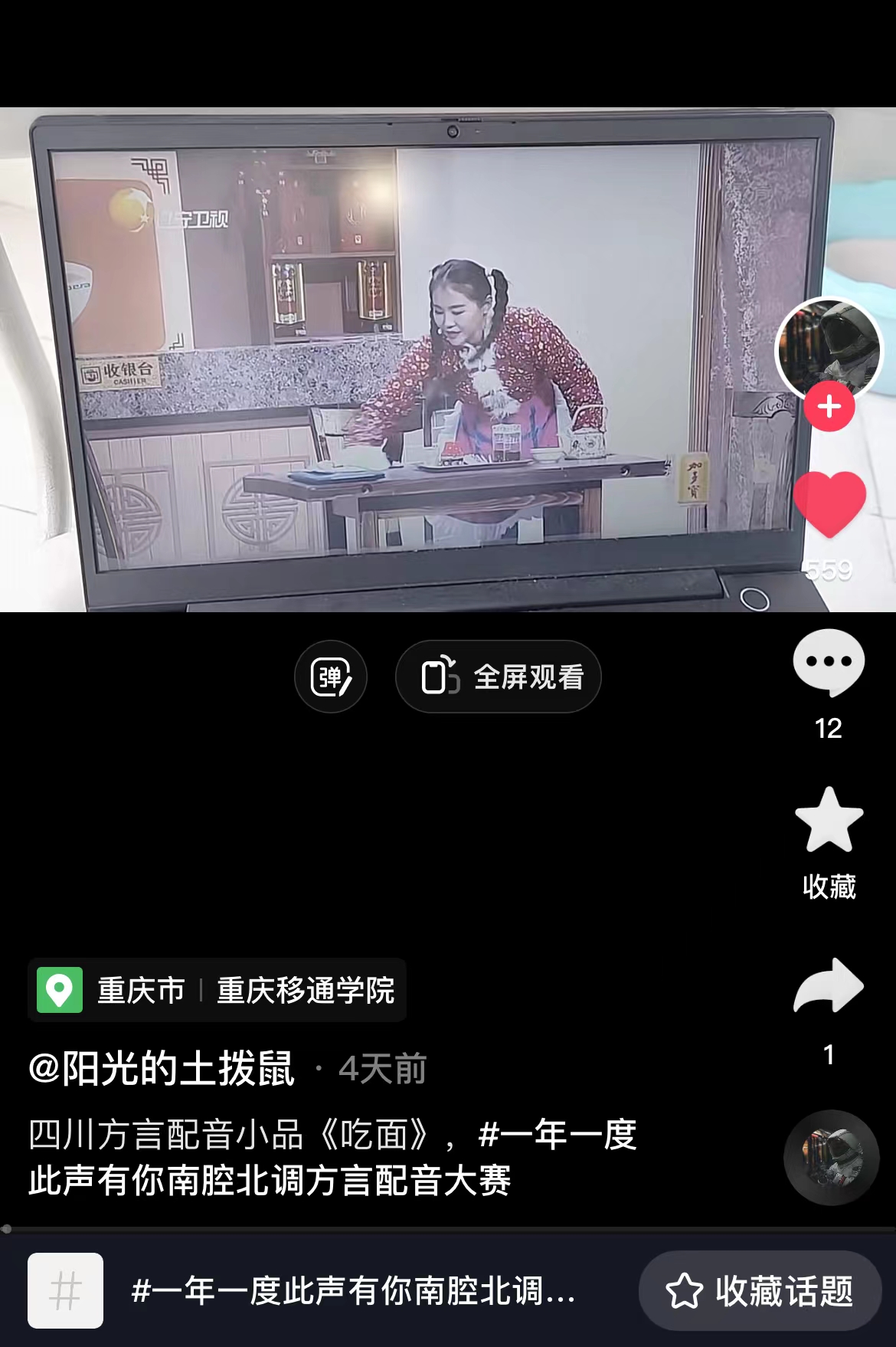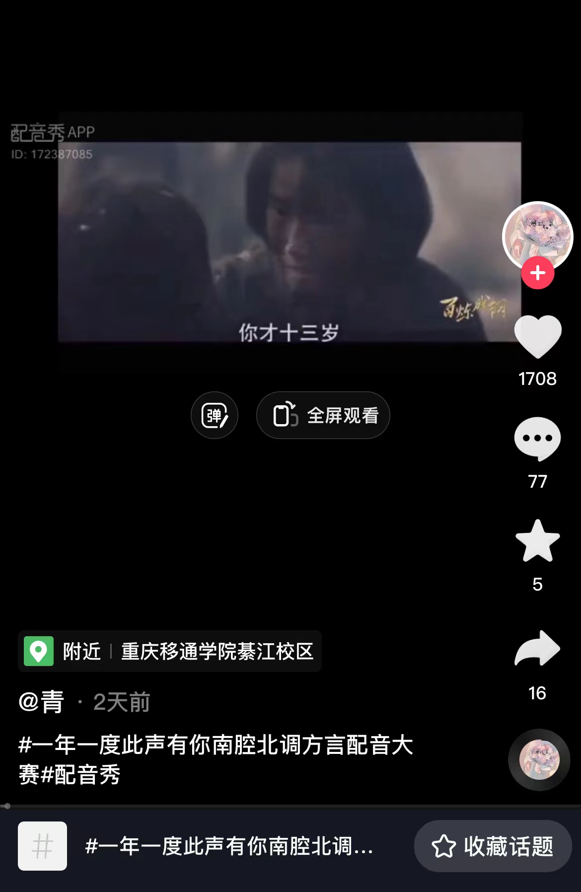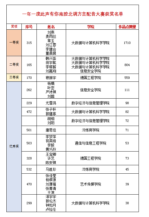 各色方言汇聚到一起,让配音大赛增添了生机与活力,譬如当猫和老鼠经典动画片段遇上闽南话,上海、河南、重庆三地方言齐配一角,轻松自如的转换令人叹为观止,温柔甜美的林姑娘配上豪爽洒脱的四川话更是别有一番风味,各色方言齐聚绽放如同家人欢聚一堂,温馨而又新奇……截止11月28晚八点本次一年一度此声有你南腔北调方言配音大赛双校区总共有1000名同学报名参与,活动持续七天总共收取614份配音作品,一年一度此声有你南腔北调方言配音大赛抖音话题总浏览量达21.3w,其中最热作品点赞量达到1710,最终根据抖音点赞量评选一、二、三等奖,根据视频内容输出、正能量宣扬以及点赞量等综合评选出优秀作品十份。