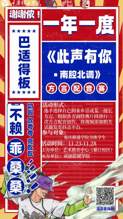 丰富我校大学生艺术生活,让同学们随时随地感受艺术带来的乐趣,回味家乡的音律,艺术教育中心綦江校区联合戏剧影视学院特此举办一年一度此声有你南腔北调方言配音大赛!十里不同音,百里不同语,风趣独特的温州话、火辣十足的重庆话、乡土情浓的陕甘话、魔性十足的东北话……你我相遇移通,距离也只是咫尺之间。你我从未谋面,但透过方言,以充满艺术性表演形式将你我心相连,各色方言合在“移”“綦”碰撞出怎么的火花呢?