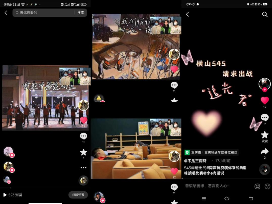 同声抗疫,寝你来战,此次活动在同学们的歌声中落下帷幕,大家用歌唱的方式,讲述封寝的时光。用音乐倾听彼此,通过抖音让更多的人听见同学们的声音;让每位同学的歌声激荡起青春的浪花;让音乐传递出爱和力量,营造出良好和谐的宿舍氛围。这些歌声也是献给身边的志愿者们,他们义无反顾,替同学们负重前行。在这份爱的力量中,相信总有一天能够战胜疫情,让同学们和老师们一起相约,在无垠的旷野上放声歌唱!