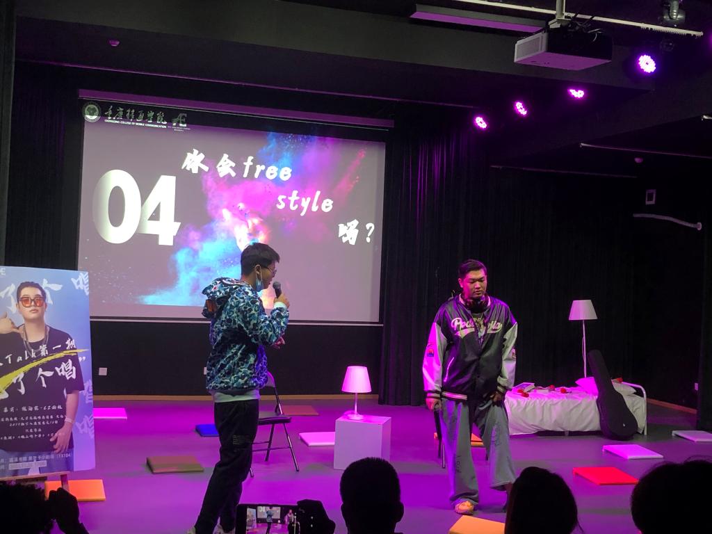 经受不住考验的rapper不是好rapper。在本期艺术talk环节设计中学弟学妹们现场给出关键词,治霖学长即兴创作他的freestyle,期间超快的应变能力、各种巧妙的创意、精彩的歌词及押韵,让移通学子们感受到了治霖学长强劲的说唱实力与说唱文化神奇的魅力。